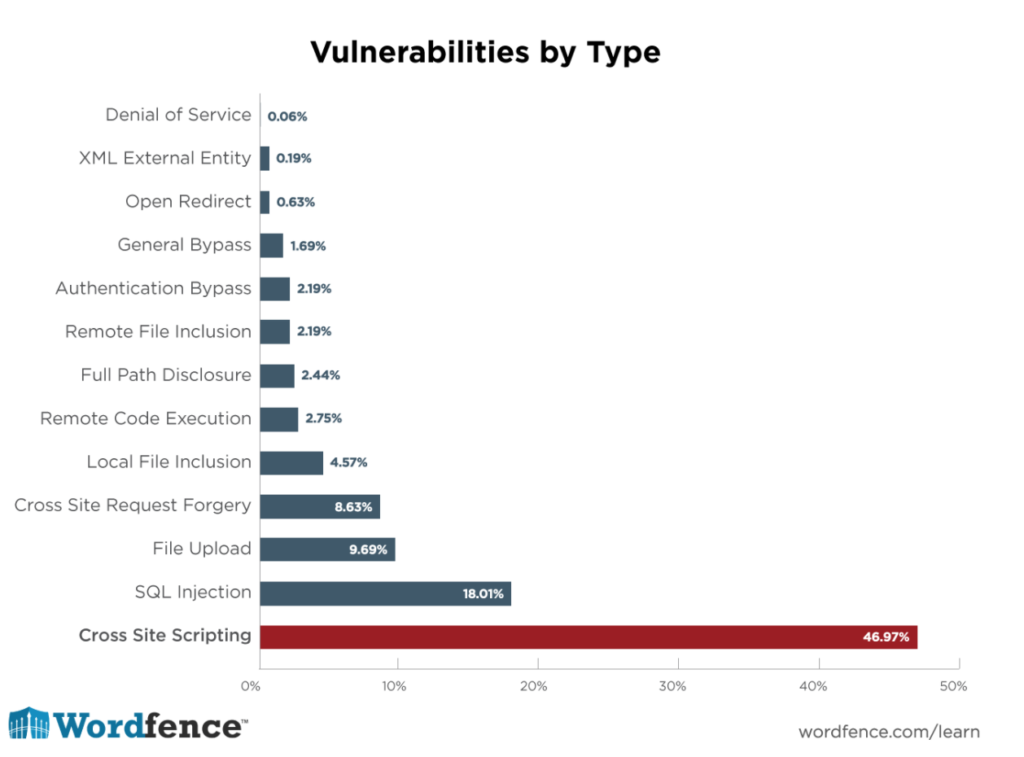 At least 47 percent of all WordPress vulnerabilities are Cross Site Scripting (XSS) vulnerabilities, according to Wordfence.