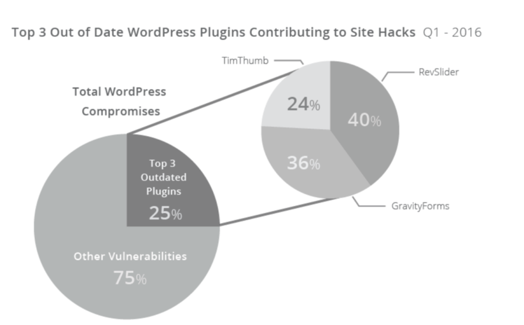 According to Sucuri, RevSlider, Gravity Forms, and TimThumb, accounted for 25 percent of all site hacks. All three plugins are out of date.