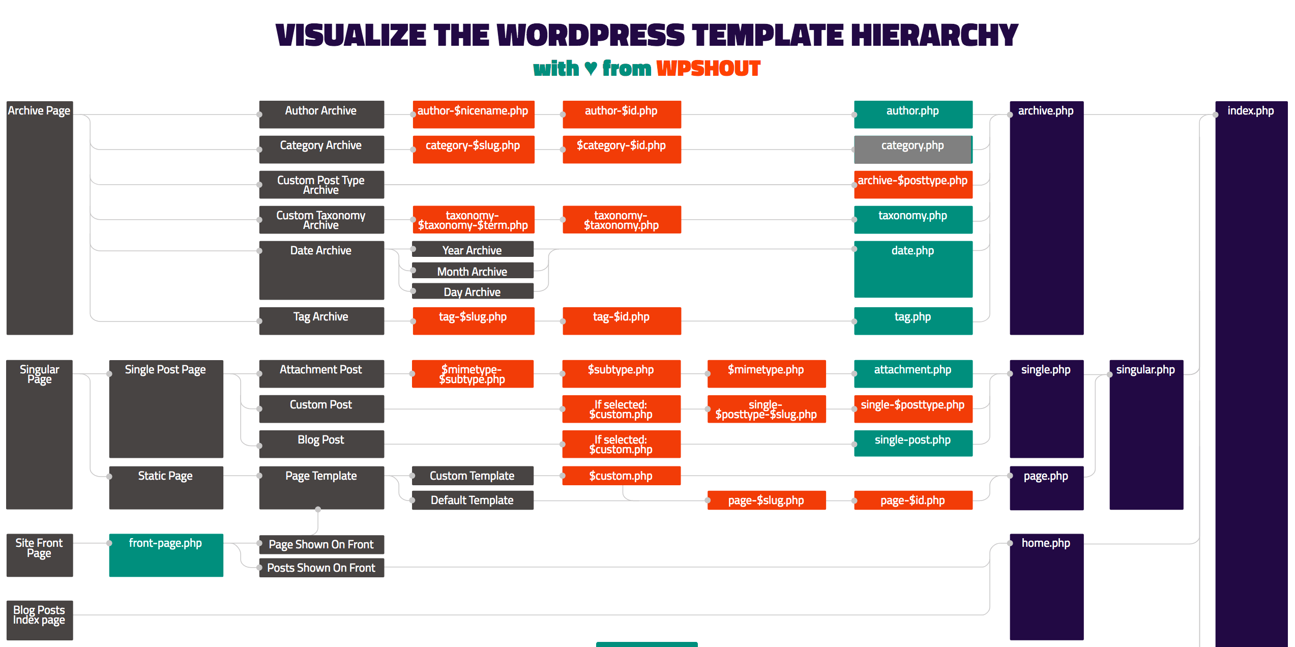 Let’s start with the WordPress template hierarchy. This has an impact on the way themes are loaded. Whether you are writing a theme or a plugin, it is important to understand how any front-end loading scripts will be incorporated into the hierarchy.