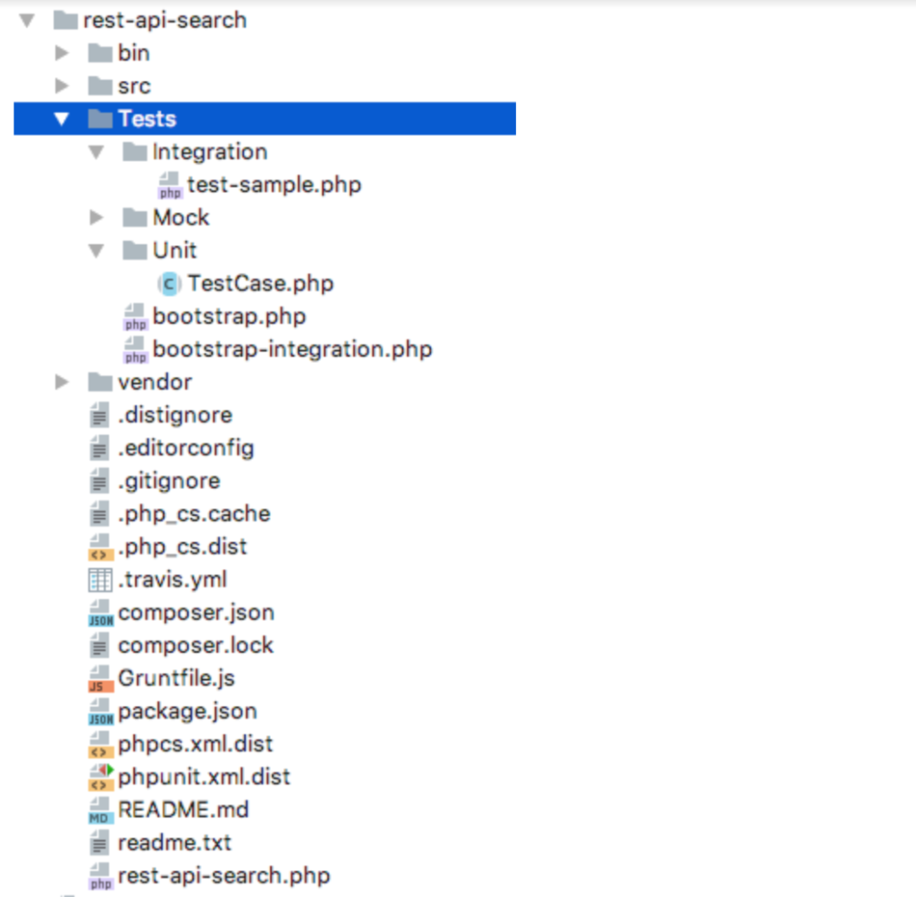 As a result, the directory for my unit test is Tests/Unit and the directory for my testing mocks is Tests/Mocks. I moved the tests WP CLI generated into their own directory and bootstrap folder that are not being used. Here is what my directory structure ended up looking like before I started adding my code in: