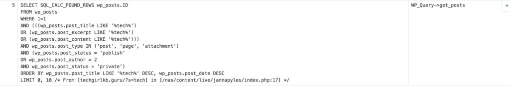 - Then we search through the post_title, post_excerpt, and post_content columns for the search term (in this example I searched “tech”).