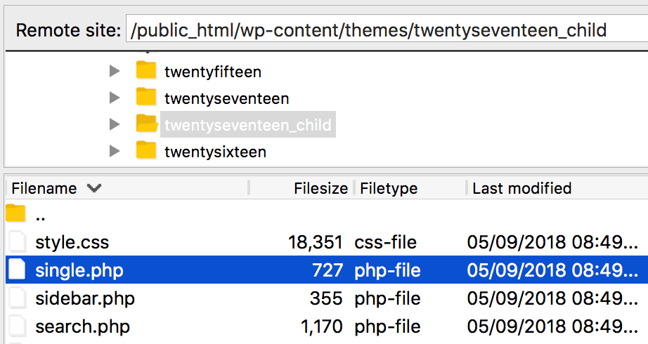 If you don’t want to start from scratch, you can copy the contents of your theme’s existing single.php template file. You can do this by accessing your WordPress site using Secure Shell (SSH) or Secure File Transfer Protocol (SFTP) – we prefer using an open-source client such as FileZilla. The file you’re looking for will be in your child theme’s folder: