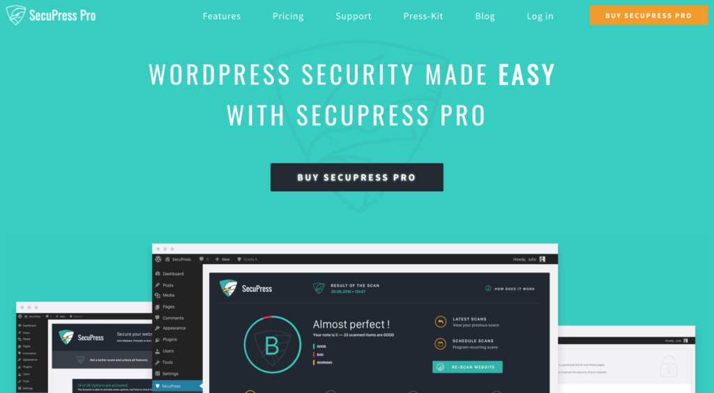 SecuPress is a media product that focuses on Scanning in six parts: Login or User, Plugins and Themes, Core, Sensitive data, Malware, and Firewall. The plugin lists down all the issues on your website which can make it easier for you to handle them.