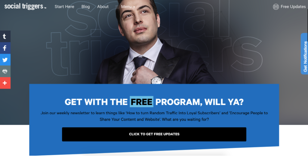 Here’s an example of a newsletter feature box on the homepage on Social Triggers, a blog that teaches people about running websites and blogs.