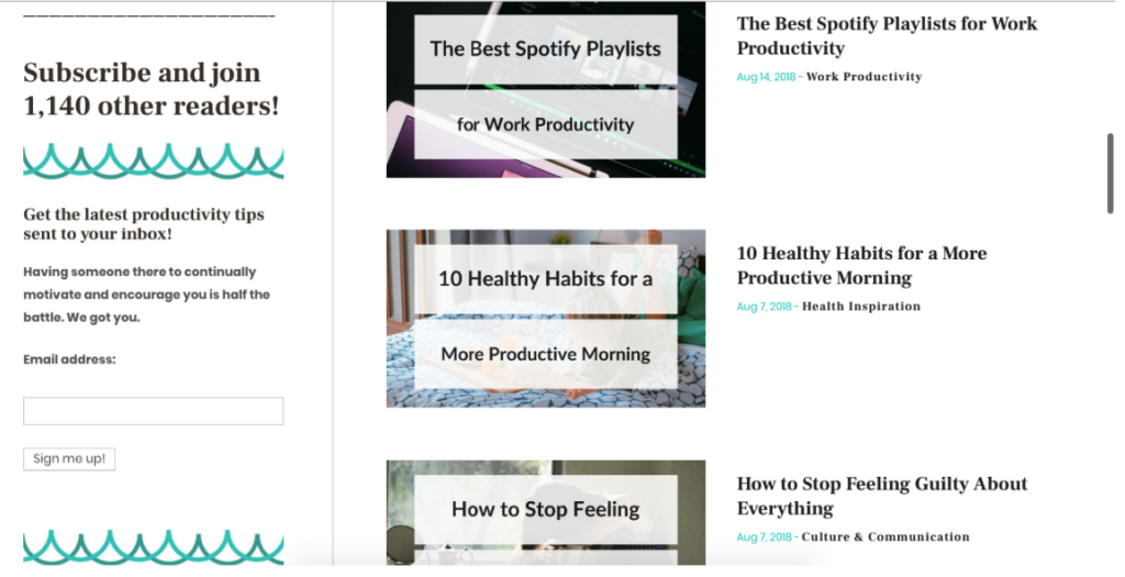My blog, Productivity Theory, which provides tips about productivity and personal development, is an example of a site that uses the sidebar form. It’s always there and is highly visible but doesn’t distract from the main content of the page.