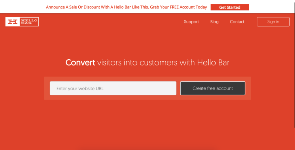 Here’s an example of what a Hello Bar looks like from hellobar.com. It’s the thin white bar across the very top of the page.