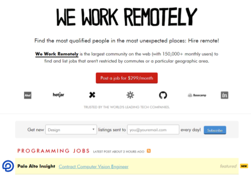 Operated by Tiny Boards, WeWorkRemotely calls itself the largest remote-only job board in the world with over 150,000 monthly users. Although it focuses primarily on coding and developing jobs in startups, there are still some great design positions on this site.