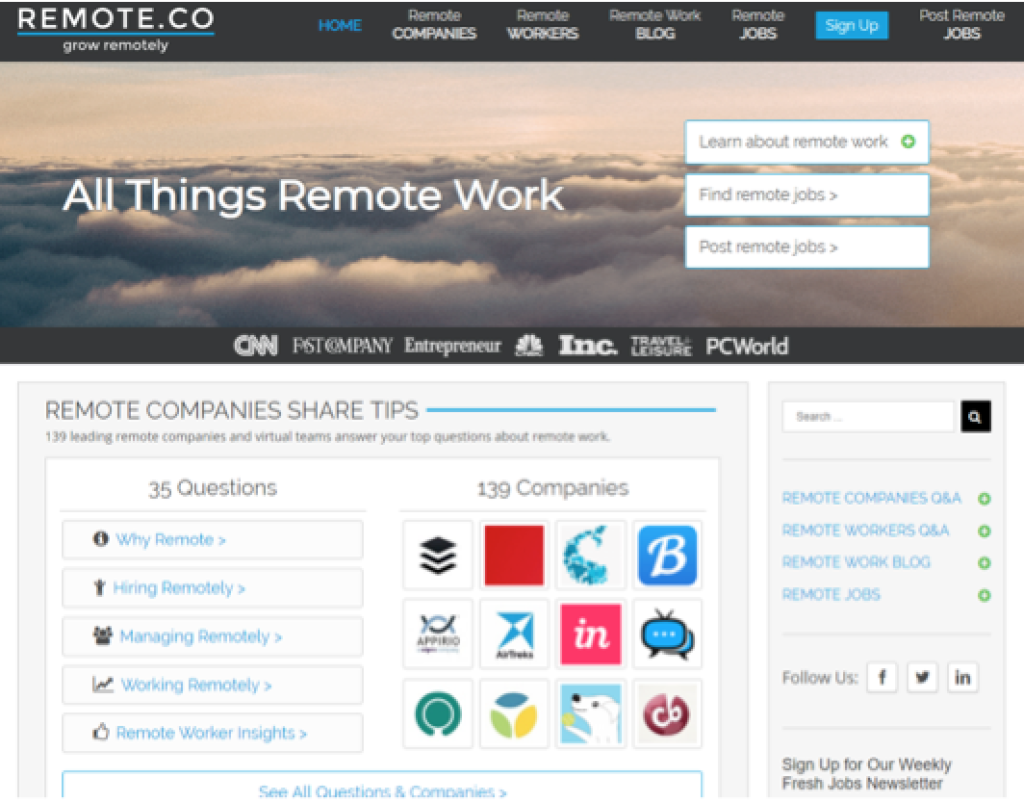 Remote.co calls itself the website for “all things remote work”. Besides a thriving job board, it also has a database of remote-only companies, a popular blog, and a community of remote workers.