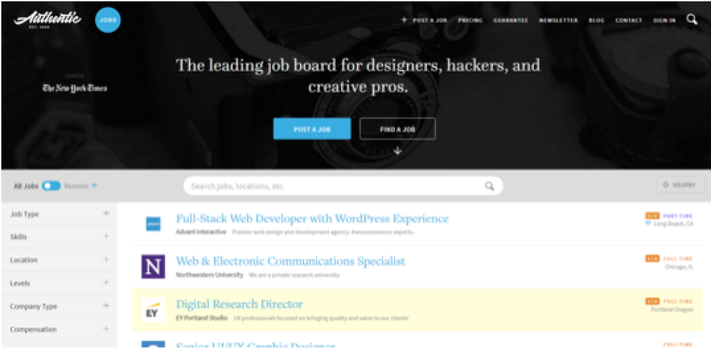 The AuthenticJobs website has been around for years and is still one of the most active job boards in the design/development category. New jobs get posted every day and the site boasts a number of tools to filter out the right gigs. You can search by company-type (startup, studio, non-profit, etc.), levels (lead, senior, mid-level, etc.), skills, and location.