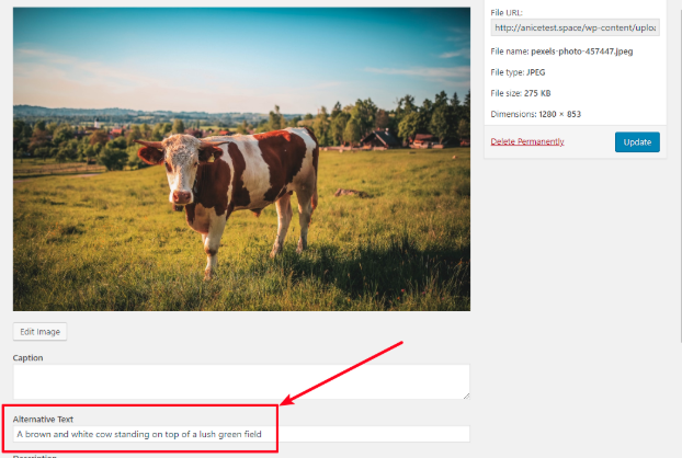 I uploaded this picture of a cow to my site. Then, Automatic Alternative Text applied the alt text of “A brown and white cow standing on top of a lush green field”: