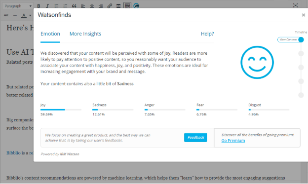 To make it easier to understand how most readers will perceive your content, Watsonfinds leverages artificial intelligence to analyze the likely emotions your visitors will feel as they read your content.