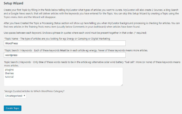 - You enter a list of keywords in your WordPress dashboard for MyCurator to use (you can also add custom sources, like RSS feeds. By default, it will just scan Google and Bing)