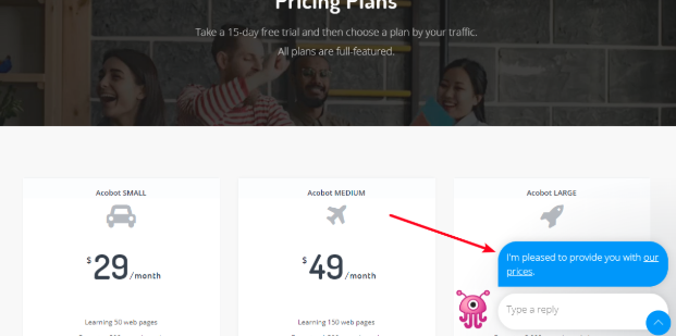 For example, Acobot Web Assistant uses conversational AI to chat with your visitors. And Acobot will actually learn over time to predict customer questions and answer them by itself.