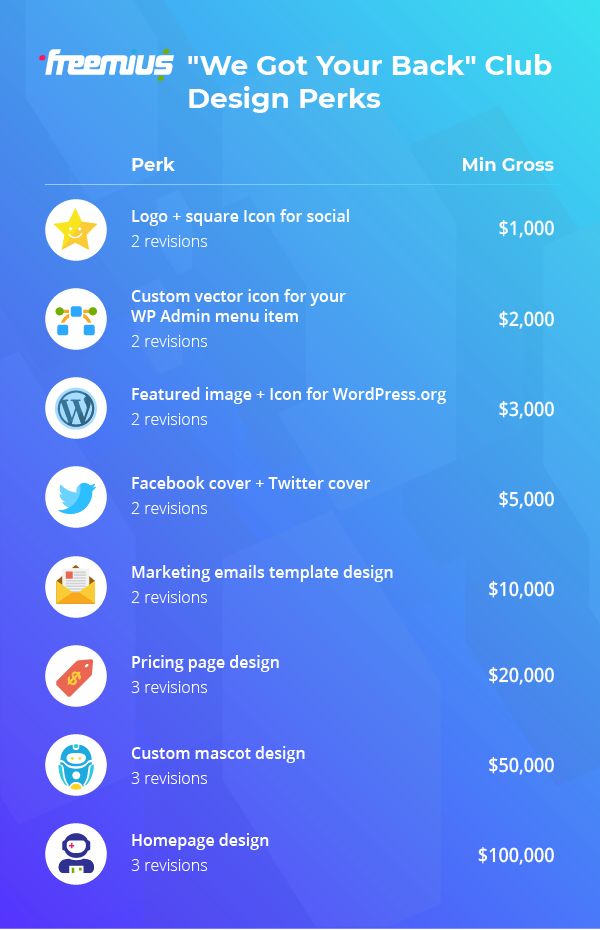 That’s why we’re launching the “We Got Your Back” program, which will help implement just that, through a very simple perks table we’ve come up with: