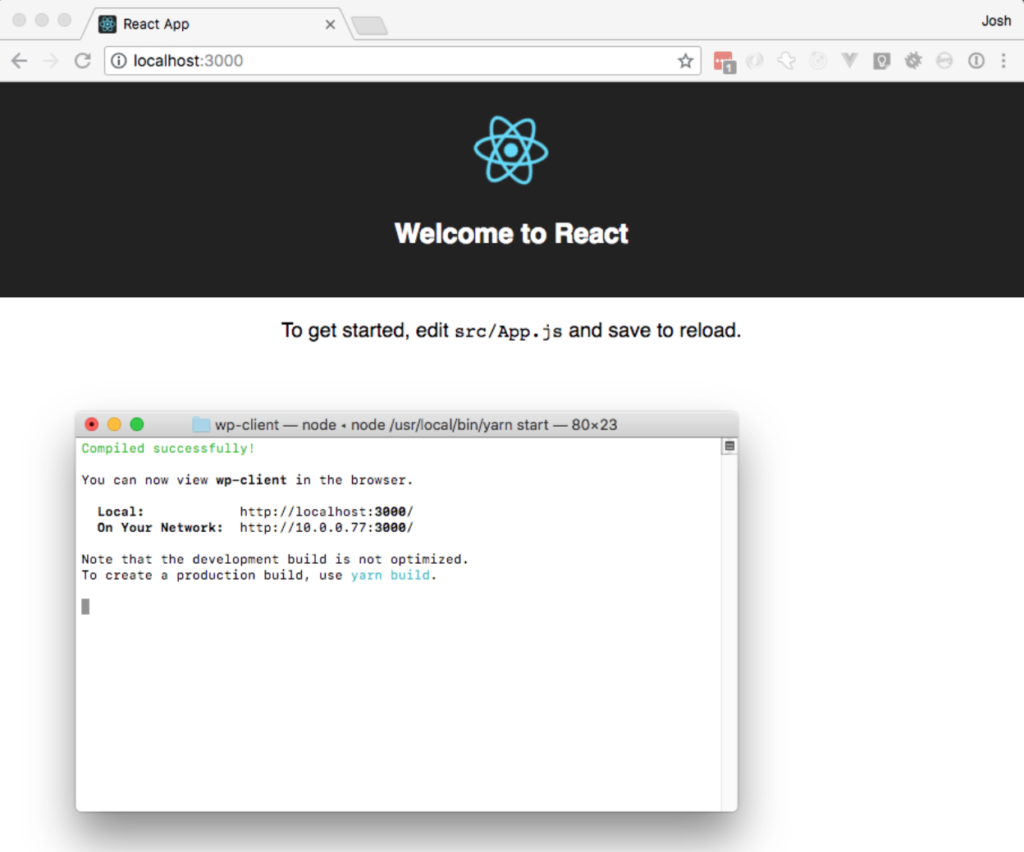 First, let’s create a new React app, with a dev server, and everything we need to run tests. Coming from a WordPress background, that sounds hard, but like a developer-friendly framework should, this is easy with React. Seriously, its three commands if you have Node, npm and yarn installed.