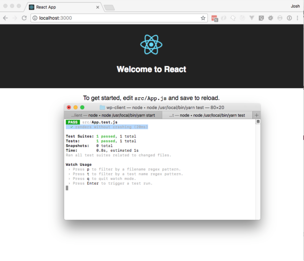 By default, create-react-app adds one test. Open up another terminal, in the same directory and start the test watcher: