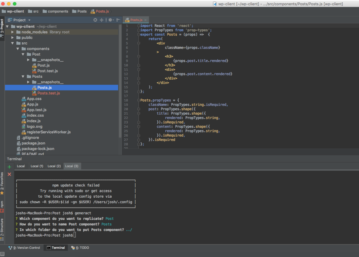 This article also covers looping through React components — for example, a Posts component that renders an array of posts using a Post component for each one — using array iterators. In order to speed up development even further, I’ll cover how I use a command line utility to intelligently copy existing components to new components.