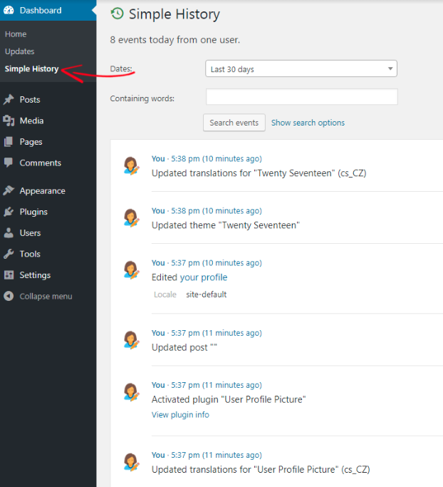 For the purpose of this article, I have installed a plugin and changed the profile picture. Now go to Dashboard> Simple History to check the logs. Here’s a screenshot below.