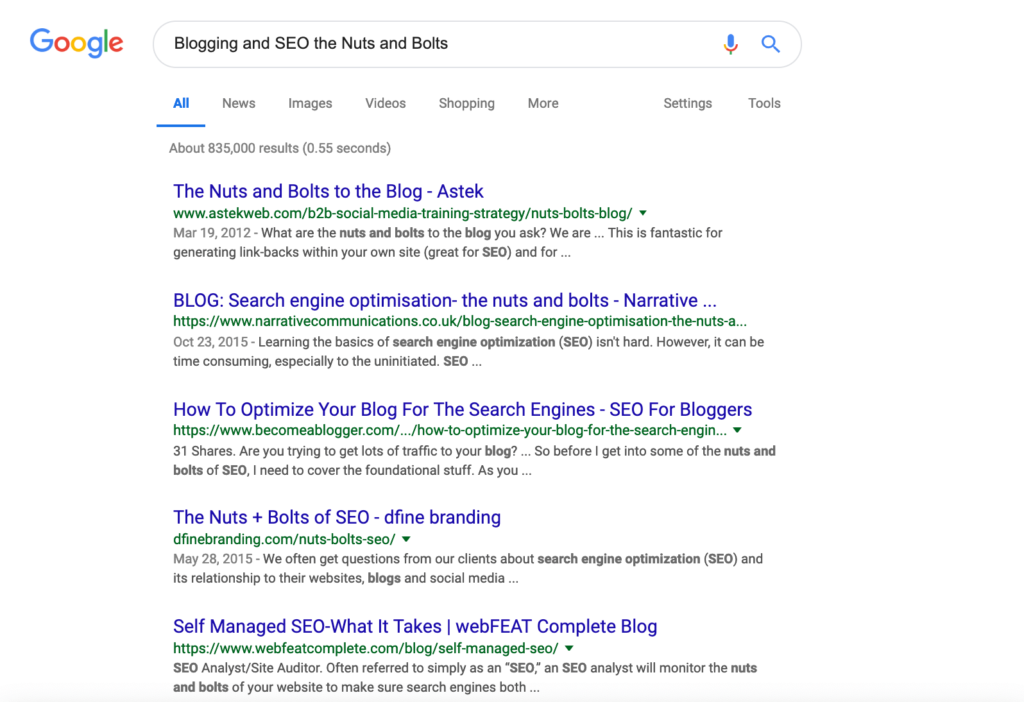 The meta description is a preview of a page’s content for readers to view. It gives them an idea of what they’ll learn when they open your page. When writing the meta description, you should view it as bait for them, optimize the text so that it contains keywords they’d search for and entices them to read further. Meta tag description should include the page title, in this case, Blogging and SEO the Nuts and Bolts.