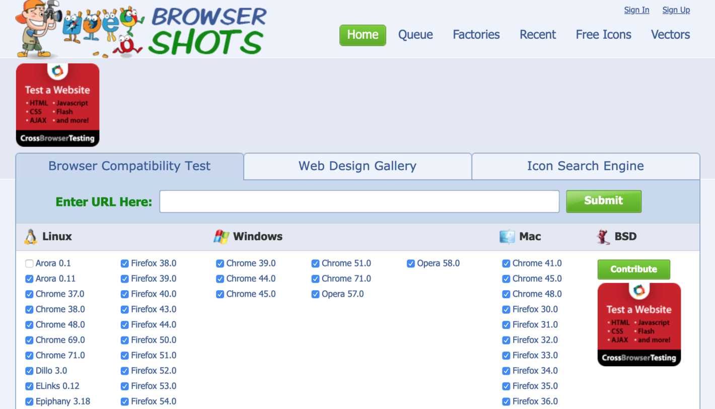 CrossBrowserTesting is a very popular, powerful and easy-to-use tool. Although it is a paid service, they offer a 100-minute free trial account to test the product. Use their “Live Test” tab after creating your account with them to load a website URL under the operating system and browser you selected.