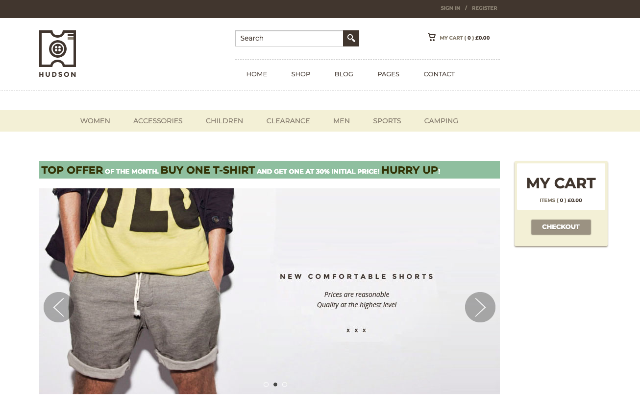Provided by TeslaThemes, Hudson is a modern ecommerce theme design. It has a playful feel about it and creates a comprehensive online shop with a slider to showcase products. You can also add a gallery to present your products and allow your customers to search by most popular, recent, and featured products.