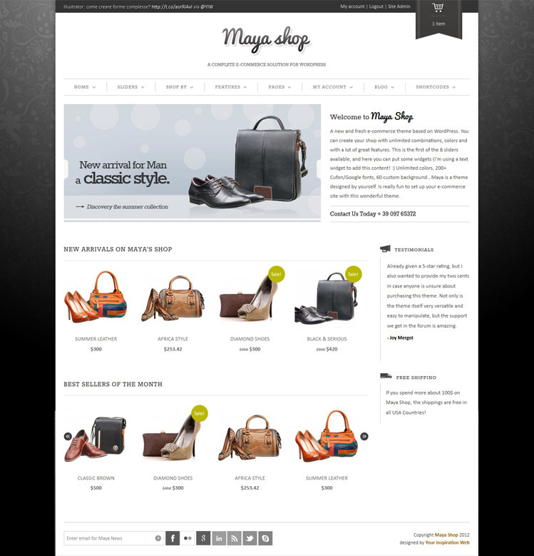 MayaShop comes with eight premium sliders. The background and color choices never seem to end, which allows you to find ones that already fit your branding. The homepage allows you to showcase featured and new products. The zooming feature on product pages helps visitors make their choices. Along with that, you improve product page quality with sections such as related products, reviews, social media buttons, and comments.