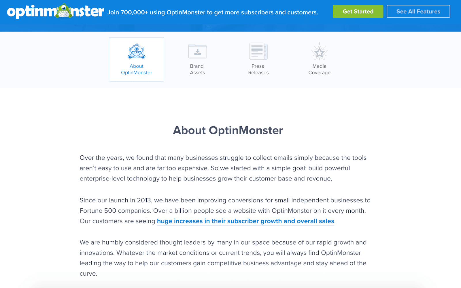 OptinMonster does a good job of explaining who they are as a company while showcasing real data that boasts their success with customers.