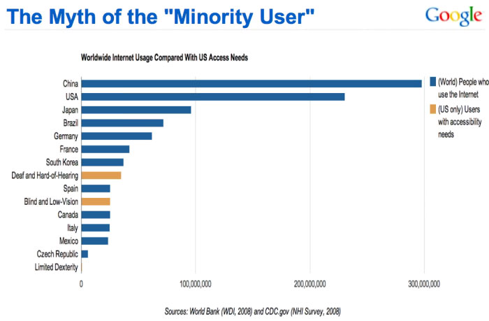 In actuality, yes. Disability isn’t so rare. 18.7% of Americans have a disability of some form. While not all of these will impair their ability to interact with the web, that’s still a staggering number, and it only includes people from the US.