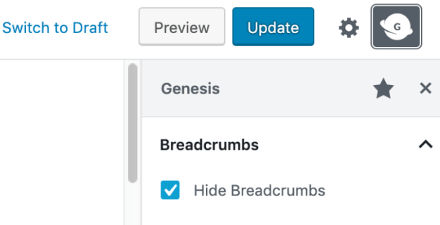 The sidebar gives users quicker access to page layout and custom class options. Additionally, you can hide titles, featured images, and breadcrumbs on individual pages and posts. It can be found at the top of any page or post by clicking on the Genesis icon: