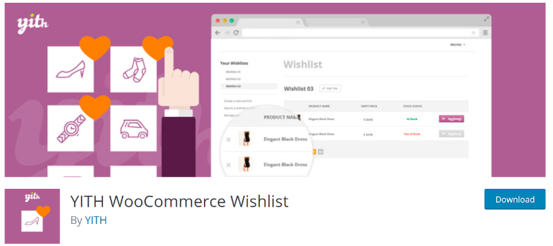 The YITH WooCommerce Wishlist plugin lets shoppers add items from your online store to a wishlist. With the plugin, you can add a link in each product detail page so users can add the item to their wishlist. Then the plugin creates a wishlist page for those items to be listed. Users can then add items from their wishlist to their cart or remove them.